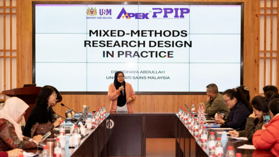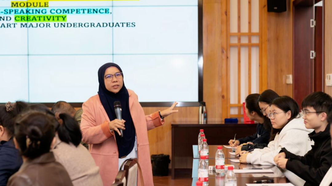 Rohaya Abdullah教授以具体的案例分析导入讲座主题。通过分析“The Effectiveness of Drama-based Speaking Module on English Speaking Competence, and Creativity Among Chinese Art Major Undergraduates” 这一案例,引领在场师生以参与式的方式分析该主题的研究目的、方法和预期目标。随后围绕主题,深入分析了研究内容所涵盖的要素、研究对象的选择、混合式研究方法的选择与设计、研究工具的具体运用与实施。