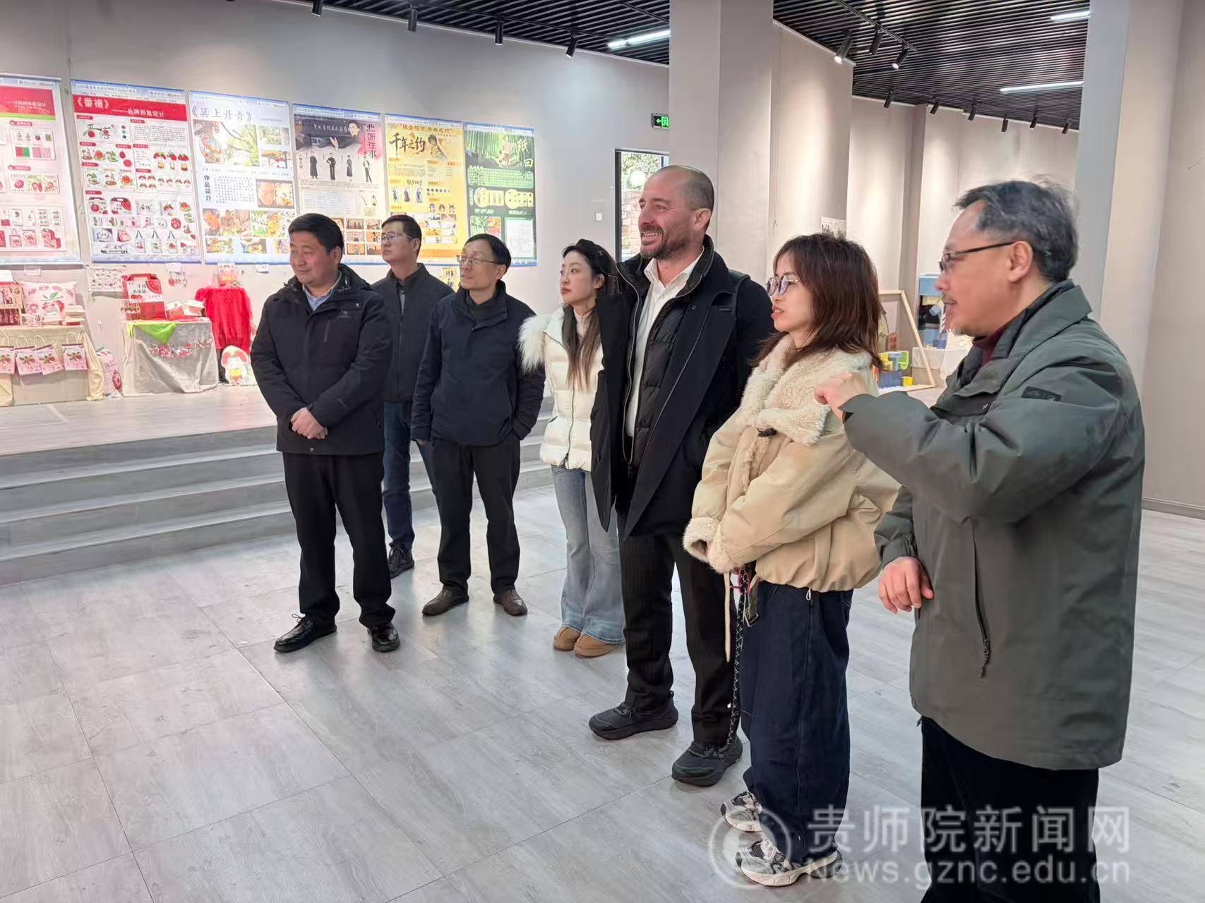 签约仪式结束后,朱利奥·圭迪校长一行参观了我校美术与设计学院。圭迪校长先后走进艺术工坊展厅、数字艺术实验室及民族民间美术展厅,实地考察教学设施与师生创作成果。聂森院长重点介绍了学院将贵州蜡染、刺绣等非遗元素融入现代设计教学的创新实践,给意方嘉宾留下深刻印象。参观过程中,双方围绕课程共建、数字化设计与传统工艺融合等话题进行了深入交流,并就未来开展联合工作坊、课程对接及师生作品国际交流等达成初步共识。